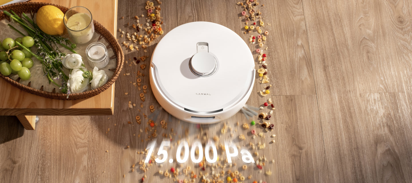 [4] Daten stammen aus internen Labortests von Narwal. Die Saugkraft wurde im Vergleich zum Freo Z10 im Basisreinigungsmodus ermittelt.