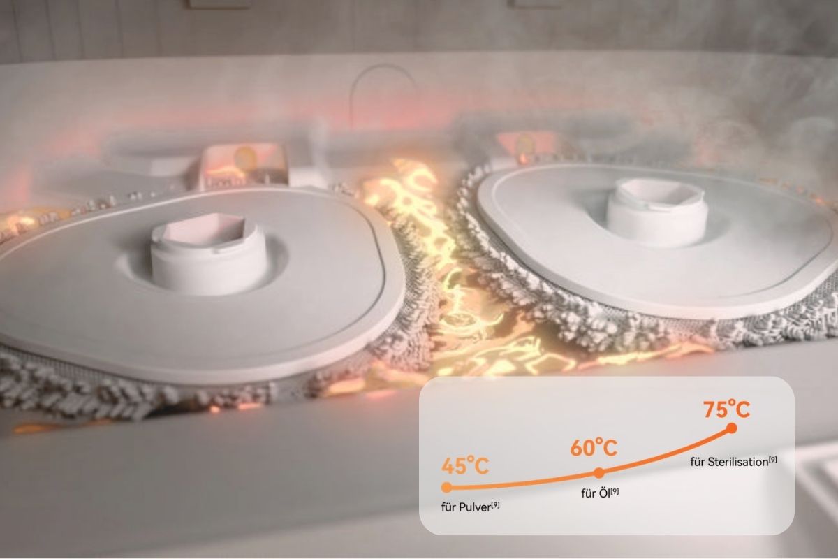 [9] Laut internen Tests von Narwal kann das Moppwasser bei Raumtemperatur auf bis zu 75 °C / 167 °F erhitzt werden. Die tatsächliche Temperatur kann durch Umwelteinflüsse abweichen.