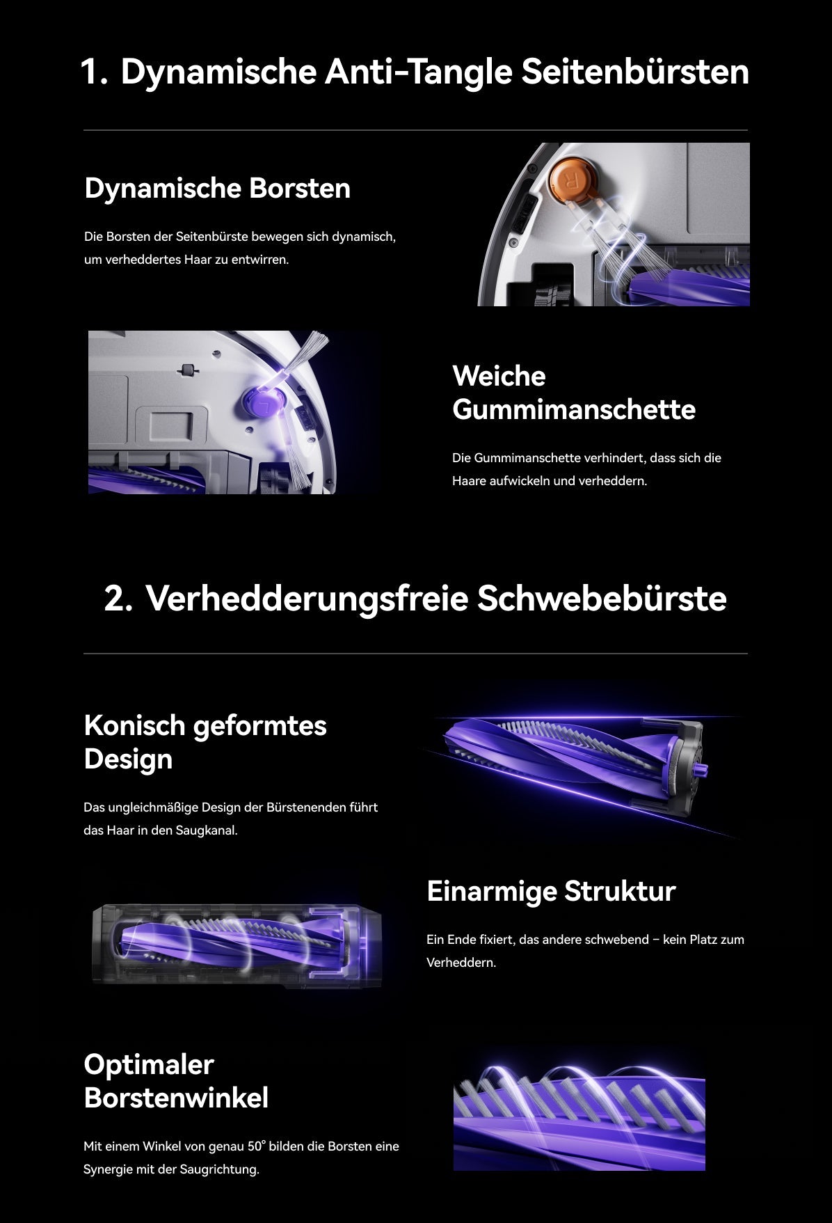Die Seitenbürsten laufen rückwärts und bilden eine „I“-Form, um die Spannung von verhedderten Haaren zu verringern.
