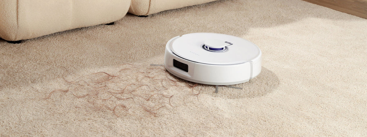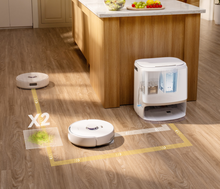 Wenn Schmutz erkannt wird, stoppt die Seitenbürste, der Freo Z10 wird langsamer, und eine Saugverstärkung beseitigt den Schmutz.