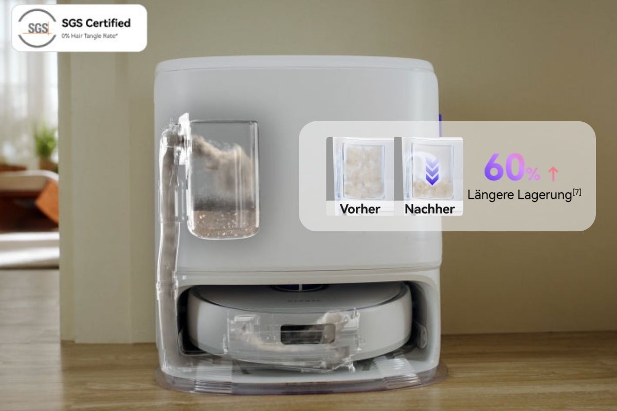 [7] Daten stammen aus internen Labortests von Narwal. Die tatsächlichen Entleerungsintervalle können durch Umweltfaktoren beeinflusst werden. Die Steigerung um 60 % bezieht sich auf die Speicherzeit des Freo X Ultra.