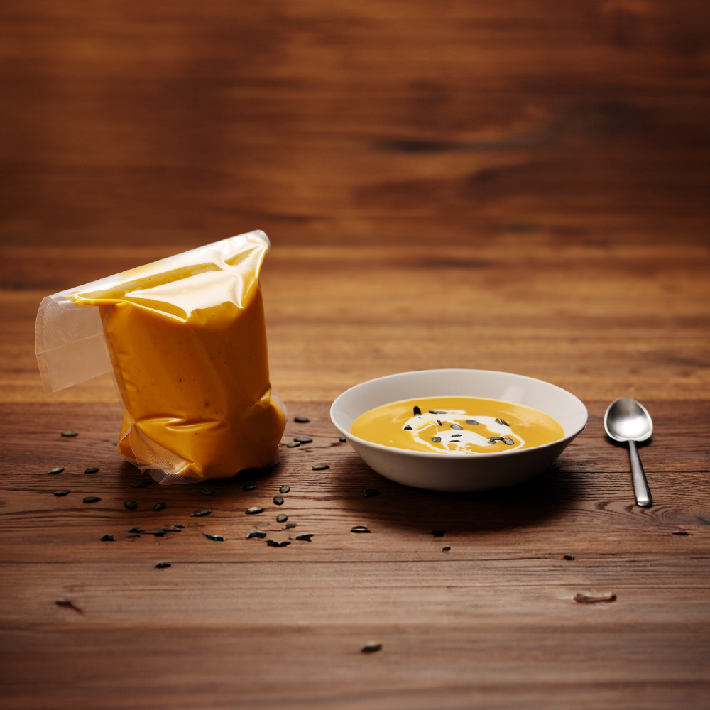 Kanäle auf beiden Seiten der Folie sorgen dafür, dass die Luft vollständig abgeführt wird. Die dreischichtige Folie mit einer Dicke von 110 μm verhindert zuverlässig das Eindringen von Feuchtigkeit und Sauerstoff. Daher eignen sich die Beutel für das Sous-Vide-Garen (< 100 ºC) und zur Lagerung im Gefrierschrank ohne die Gefahr von Gefrierbrand (> -20 ºC).